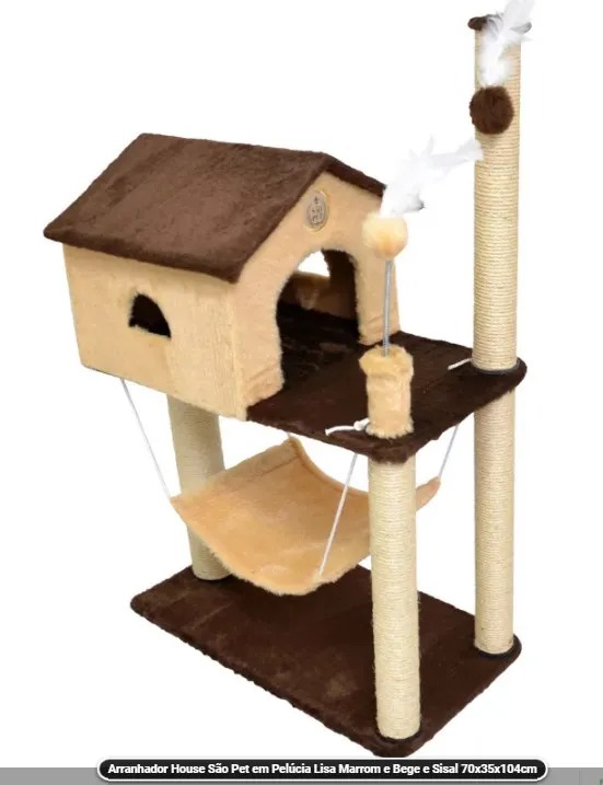 Casinha clássica, com pilares revestidos em sisal. Possui rede e tubo com bolinha chocalho, para entretenimento. Proporcionando conforto e lazer, para seu pet, em apenas um produto.